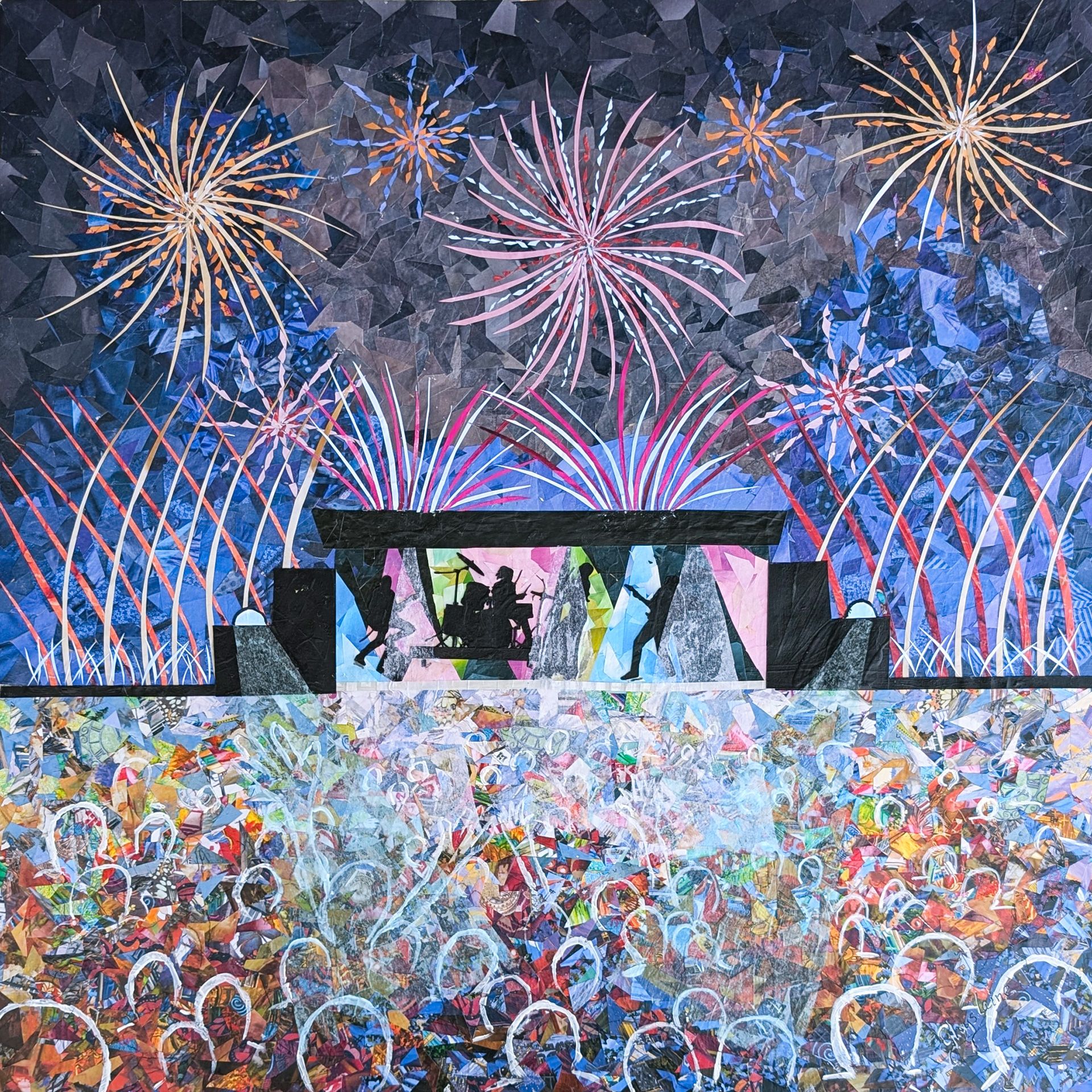 Par la juxtaposition de fragments découpés dans des magazines, l’oeuvre cherche à recréer le tumulte visuel et sonore d’un moment festif où musique, lumière et émotions s’unissent. Les silhouettes sur scène se fondent dans l’explosion des couleurs, rappelant que l’art, qu’il soit sonore ou visuel, est avant tout une expérience collective et immersive.